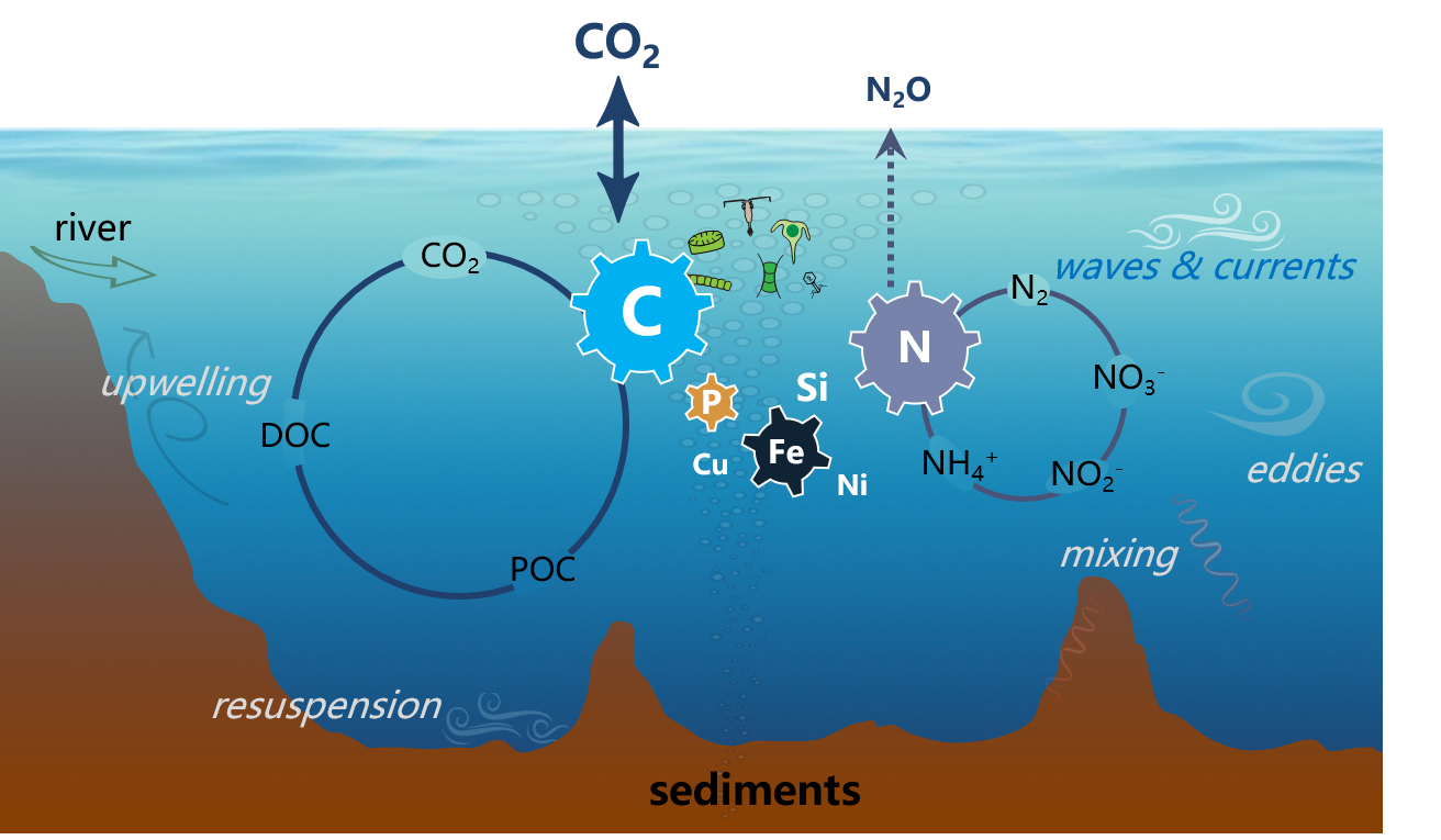 •Investigate the marine biogeochemical cycles of essential biogenic elements, including carbon, nitrogen, and iron.