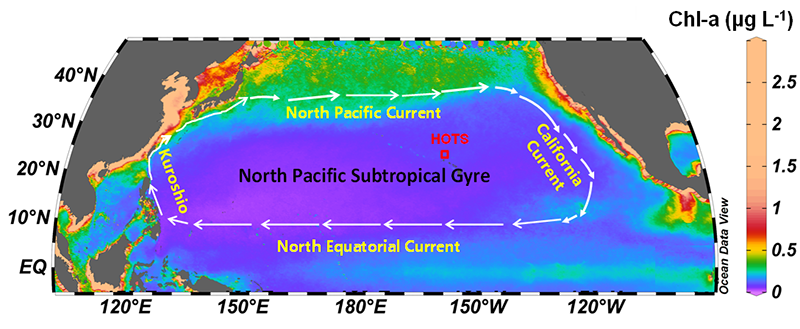 The oligotrophic ocean occupies about 30% of the ocean surface and has been conventionally regarded as ocean deserts. It is characterized by nutrient depletion in the surface waters and extremely low net biological production and hence, per unit area, contributes little to carbon export from surface to deep waters. Emerging evidence, most notably based on ocean time-series studies such as those at the Hawaiian Ocean Time-series station, has shown a wider than previously assumed dynamic range of nutrient inputs and biological responses in this oceanic system. This project selects the North Pacific Subtropical Gyre (NPSG), one of the world’s largest oligotrophic regimes, as the study site to examine carbon fixation and export, or the biological pump in general, regulated by differently sourced nutrients including macronutrients (i.e., N, P, Si) and micronutrients (e.g., Fe).