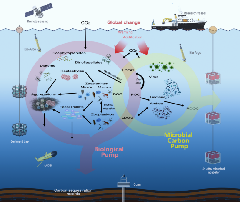 Ocean, the largest carbon reservoir in the earth surface, plays an important role in the global carbon cycle, which has significant impact on the earth's climate system. Biological pump (BP) and microbial carbon pump (MCP) are two of the most important pathways for the carbon sequestrations, the efficiency of which modulates determined the carbon stock changes in the ocean and atmosphere. This project aims to clarify the ocean carbon sequestration mechanism of carbon process and interpretation of ocean acidification effect on carbon sequestration and storage, establish the marine sedimentary carbon stock changes linked to global change, further analysis in the process of marine ecosystem carbon storage multiscale regulation mechanism. According to the key scientific problem and target, 4 themes "process of carbon fixation carbon storage mechanism - acidification effect - carbon stock changes" were set up around the core scientific question. Three typical ecological system (continental shelf, basin and coral reefs) in the South China Sea with significant differences of biological community structure and carbon library changes were taken as the study sites. Project will be initiated from the modern biogeochemical process, to demonstrate marine ecosystem carbon process and mechanism of carbon storage and its response to ocean acidification at different levels. Combined with different carbon stock changes of sedimentary systems in 2000 years and high-resolution sea water temperature, pH and carbon library records since the industrial revolution, to explore the ocean carbon stock changes to natural changes and human activities in response mechanism, to clarify regulation mechanism of the biological pump and microbial carbon pump.