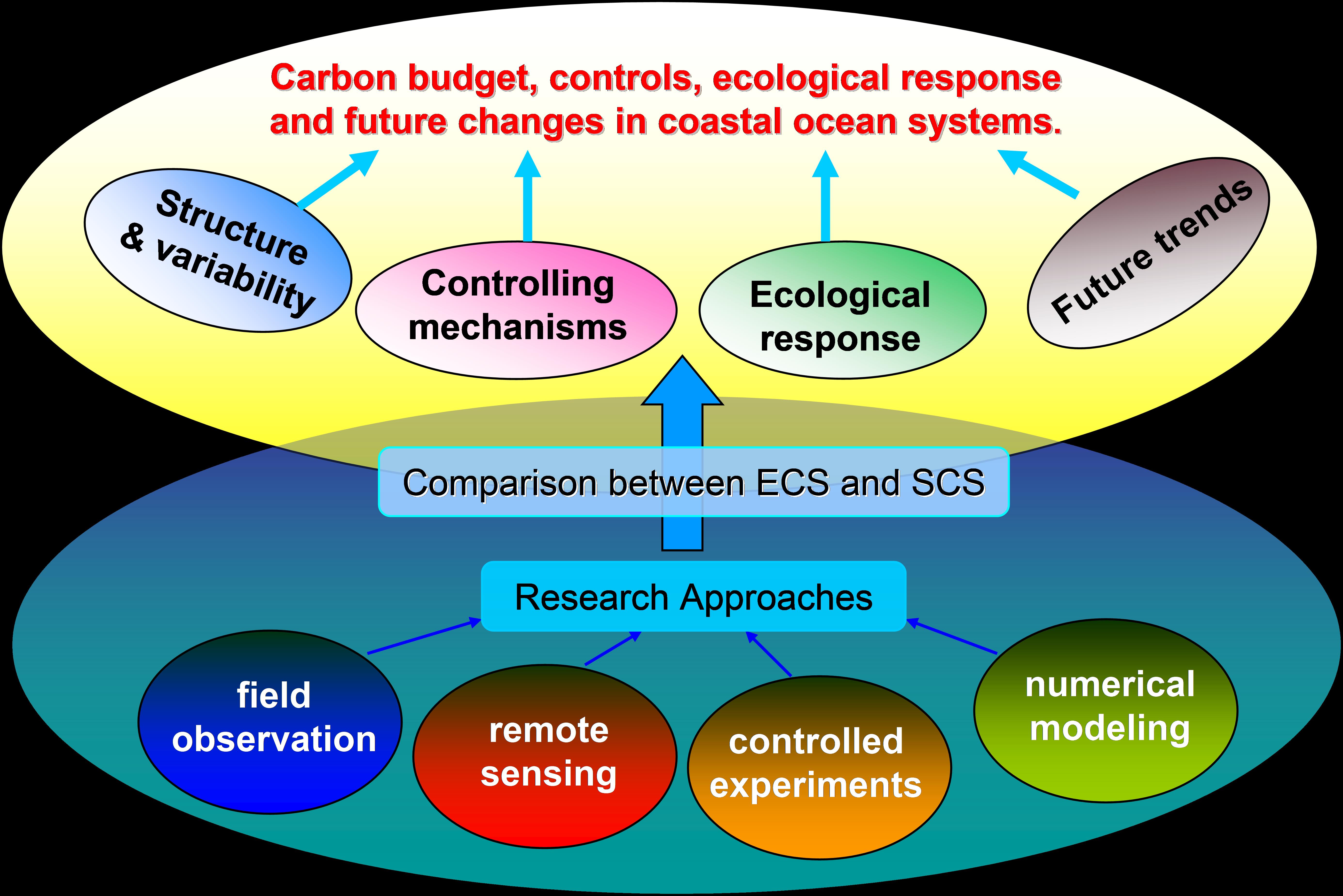 CHOICE‐C focuses on the carbon budget, controls, ecological response and future changes in coastal ocean systems. The focal area includes, but not limited to the continental shelves in both the South and East China Seas. Through an integrated study of the carbon cycling between field observation, remote sensing as well as numerical modeling in China seas with a contrast/ comparison strategy, CHOICE‐C aims to determine the source and sink terms of atmospheric CO2 and their associated controlling processes. What follows concentrates on the ecological response of the uptake of anthropogenic CO2, primarily on the ocean acidification during the past 1‐2 hundred years.