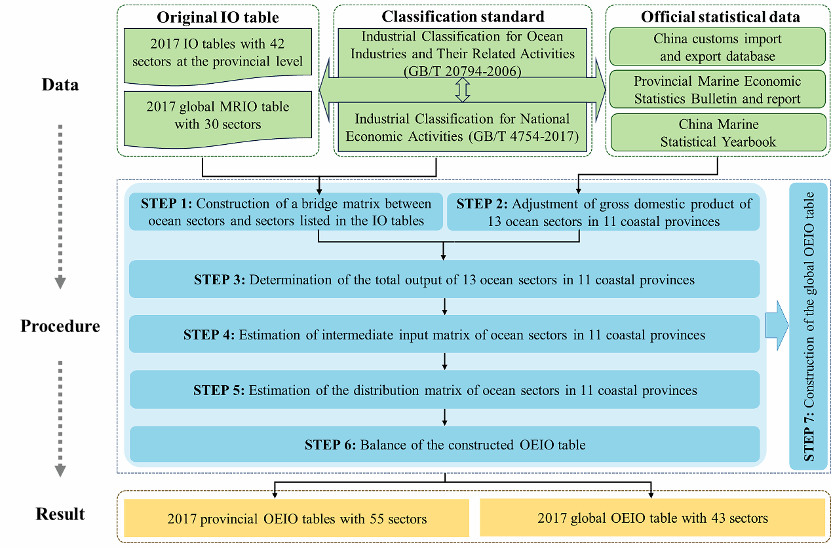 The ocean economic input-output (IO) tables are essential databases for analyzing the ocean economy. However, the IO tables issued by Chinese government’s statistical department adopt the conventional economic sector classifications, which fall short in capturing the heterogeneity of the ocean and land sectors. To fill this gap, we used the stripping coefficient method to construct the ocean economic IO tables of 11 coastal provinces in China, relying on the latest official provincial IO tables in 2017 and ocean economy data published by official institutions. The provincial ocean economic IO tables, which reflect the interconnectedness among 13 ocean sectors and 42 land sectors, could be widely used to support the ocean policy evaluation at the provincial level. To clarify the interlinkage between Chinese ocean economies and foreign economies, we further differentiated the Chinese ocean sectors from a global multi-regional input-output table that contains Chinese provinces. This dataset could be used to evaluate the development of ocean economy in China from a global perspective.