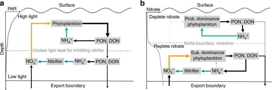 Abstract: Phytoplankton assimilation and microbial oxidation of ammonium are two critical conversion pathways in the marine nitrogen cycle. The underlying regulatory mechanisms of these two competing processes remain unclear. Here we show that ambient nitrate acts as a key variable to bifurcate ammonium flow through assimilation or oxidation, and the depth of the nitracline represents a robust spatial boundary between ammonium assimilators and oxidizers in the stratified ocean. Profiles of ammonium utilization show that phytoplankton assemblages in nitrate-depleted regimes have higher ammonium affinity than nitrifiers. In nitrate replete conditions, by contrast, phytoplankton reduce their ammonium reliance and thus enhance the success of nitrifiers. This finding helps to explain existing discrepancies in the understanding of light inhibition of surface nitrification in the global ocean, and provides further insights into the spatial linkages between oceanic nitrification and new production.