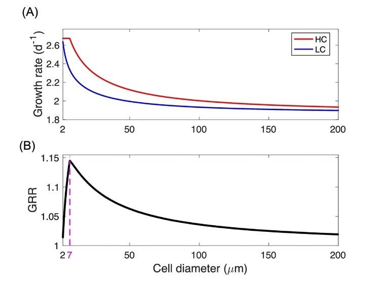 图2丨模型模拟结果。在海水CO2低浓度(LC:10 μM)和高浓度(HC:20 μM)条件下,硅藻生长速率(A)和GRR(B)随细胞直径的变化。