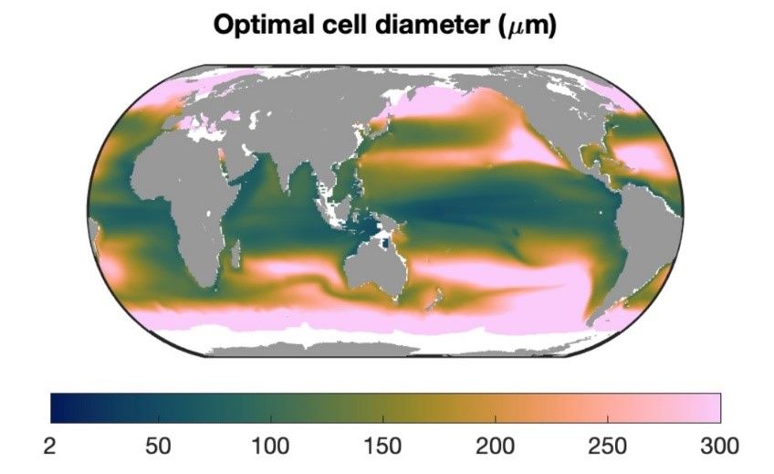 图4丨初步预测的RCP 8.5场景下本世纪内从海水CO2上升获益最高的硅藻粒径。
