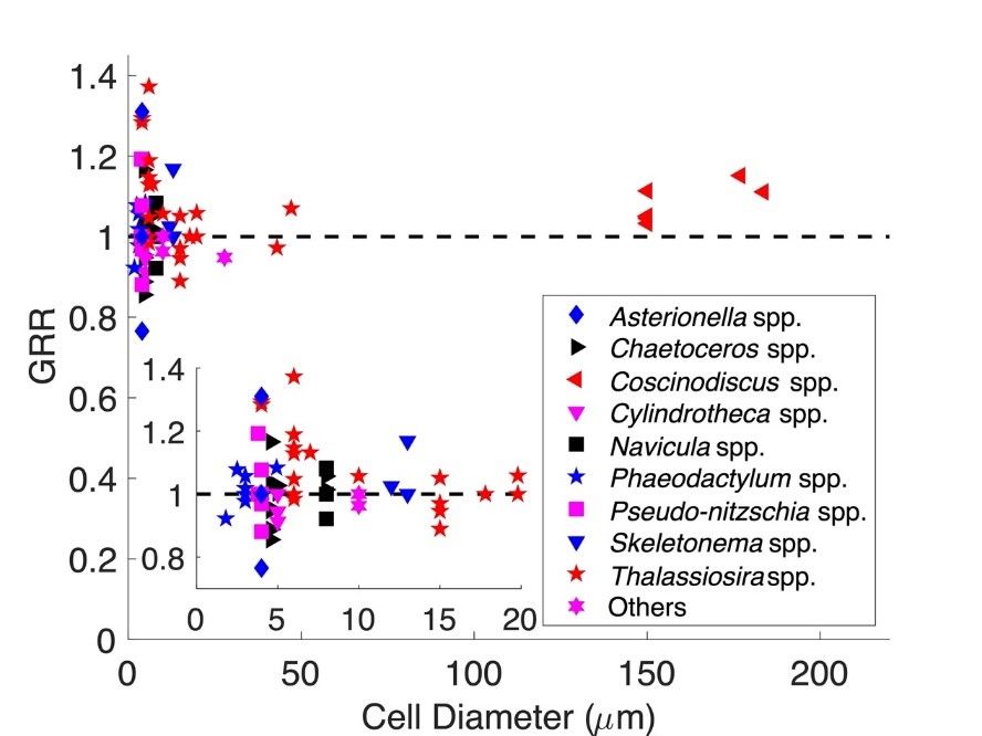 图3丨硅藻CO2加富实验的GRR历史数据与细胞粒径的关系。