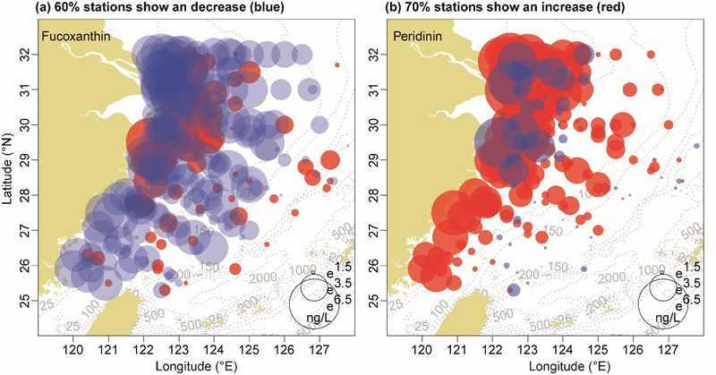 该研究团队收集了东海14年(2002–2015年)累积23个现场航次的2816个浮游植物光合色素样本,分别以硅藻和甲藻的特征色素岩藻黄素(Fucoxanthin)和多甲藻素(Peridinin)为研究对象,通过广义线性模型(GLMs)、广义相加混合模型(GAMMs)等多种统计学手段,建立了东海硅藻和甲藻对主要环境因子的响应模式,对硅藻和甲藻时空演替的环境驱动因子做了细致探讨。结果表明,硅藻和甲藻对温度和营养盐(氮、磷及其比值)变化的响应模式不同:硅藻偏好低温和高营养盐,而甲藻对温度和营养盐相对不敏感,但倾向于低磷和高氮磷比的环境。硅藻和甲藻的这些生态位特性差异决定了升温导致的低营养盐及富营养化引起的高氮磷比值都会促进甲藻的快速生长。基于GAMMs模型,该研究进一步对硅、甲藻在未来全球变暖和富营养化双重压力下的响应动态做了定量预测。结果显示,假设温度和氮磷比(取对数)各升高两个单位,东海约60%的区域将出现硅藻生物量的下降,约70%的区域甲藻生物量将升高;变化最大的近岸区域硅藻生物量将降低19%,甲藻生物量将升高60%。