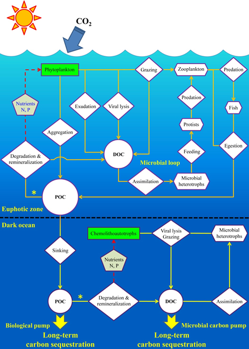 3) Surface-associated microbiota influence, via microbial respiration, the biodegradation of marine particulate organic matter (POM), and thus the remineralization depth of sinking POM, the carbon sequestration efficiency of the biological pump, and the ocean's modulation capacity of atmospheric CO2 concentration and climate change. Furthermore, surface-associated microbiota prompt the regeneration of nutrients through POM biodegradation, thus enhance photosynthetic CO2 fixation in the euphotic zone and chemolithoautotrophic CO2 fixation in the twilight and aphotic zones (Fig. 1). Therefore, surface-associated microorganisms play important roles in the modulation of global climate change and the ocean's environmental change.