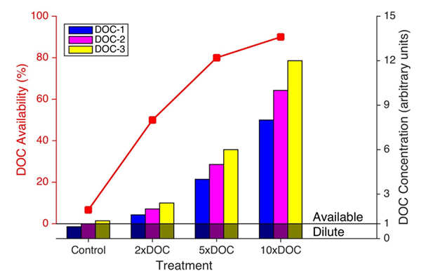 “稀释假说”可以通过浓缩实验来验证。若“稀释假说”成立,我们可以假设3种深海典型DOC(图1中的柱状图形),浓度分别略低于、等于和略高于阈值(图1中以浓度1表示)。则在阈值以下的DOC认为是被稀释(dilute)的、在图中以加阴影表示其不可利用;只有高于阈值的部分,DOC才可以被微生物利用。因此,在原始样品(Control)中可以被微生物利用的DOC的比例是非常低的。当DOC的浓度增加到2倍、5倍和10倍后,由于增加的DOC基本都是在阈值以上而可以被微生物利用,因此DOC可以被利用的比例快速上升,从原始样品的低于10%,增加到接近90%。但是,在Arrieta et al. (2015)的结果中,随着DOC浓度的上升,并没有显示出DOC被微生物使用的比例的变化。因此,其实验结果并没有证明“稀释假说”。因此,深海DOC库中的RDOC,既有因为浓度过低而无法被微生物利用的一部分(即RDOCc),也有因为DOC分子具有特定环境下的生物利用惰性的一部分(即RDOCt)。这也再次验证了焦念志课题组2014年在Biogeosciences上发表的前瞻性综述论文中的观点。