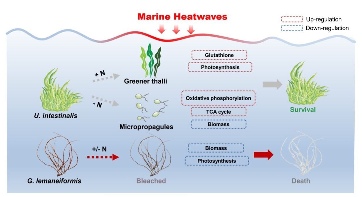 图1丨肠浒苔和龙须菜对海洋热浪和氮加富差异性响应的示意图