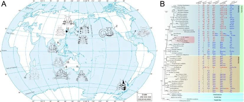 鼻稚虫属12个有效种的模式产地(A)和系统发育树(B)