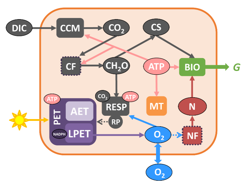 本研究结合已有理论和实验室数据,构建了束毛藻生态生理模型,对海洋固氮生物如何有效调控胞内氧气以利于固氮进行了定量分析,得出以下观点:1)束毛藻通过日间时段光合和固氮作用在时间上的错峰,即可在单个细胞内解决光合产氧对固氮的抑制这一难题;2)束毛藻的光合和固氮作用可能不存在空间隔离。