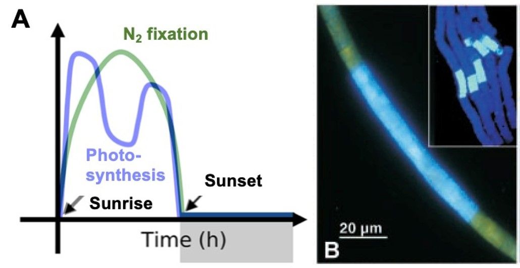 图1. (A)束毛藻光合和固氮速率日间变化示意图(改自Inomura et al. 2019, mSystems);(B)免疫荧光法显示束毛藻固氮酶集中分布于一段细胞(来自Berman-Frank et al. 2001, Science)