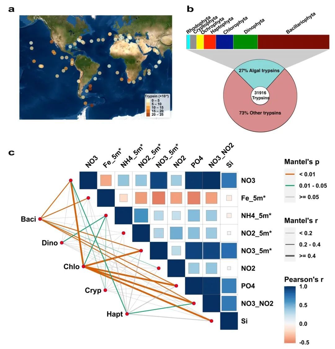 图1. 胰蛋白酶在全球海洋浮游植物中的广泛分布及对环境营养盐的响应