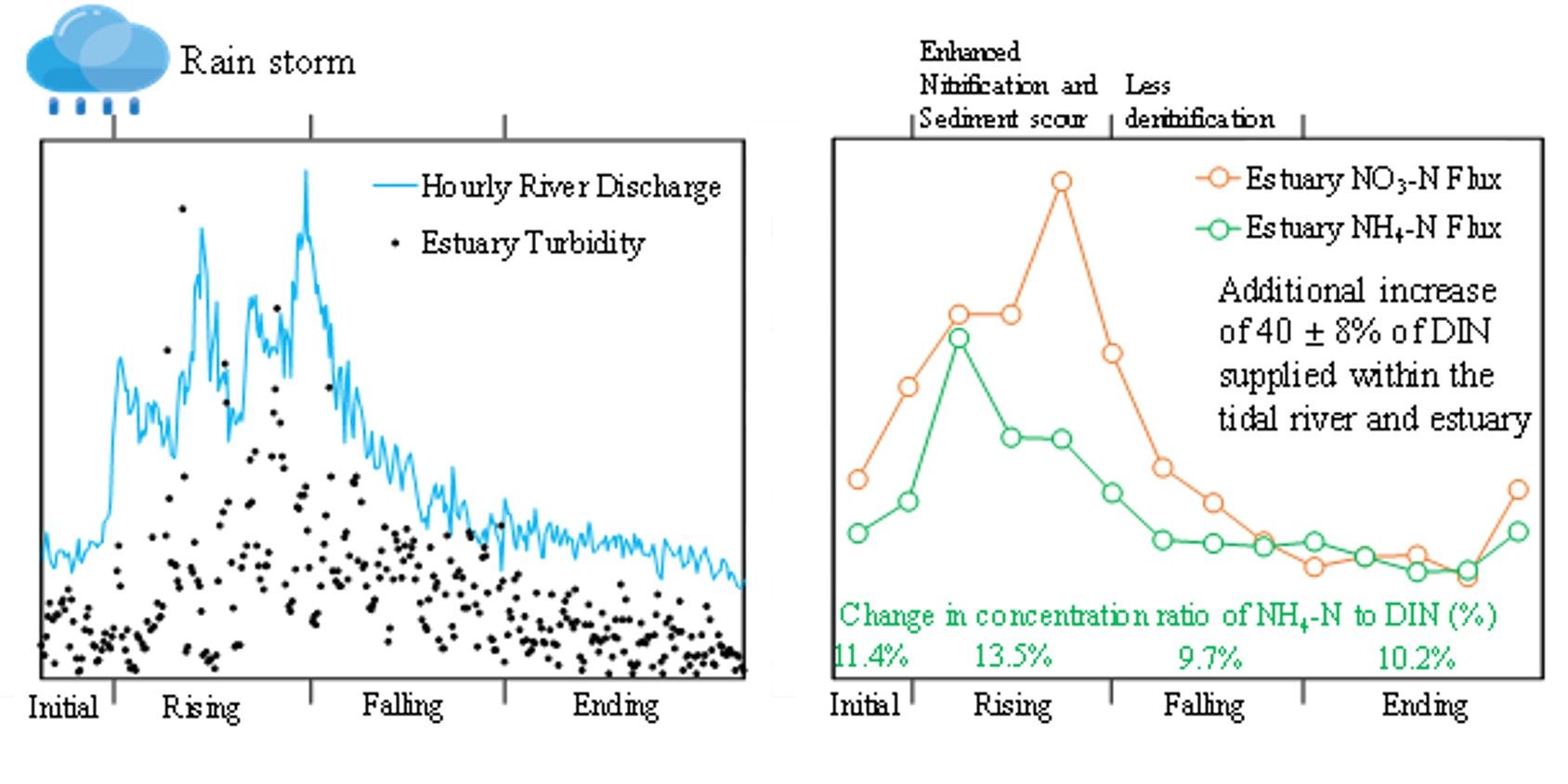 图1. 暴雨洪水过程九龙江河流-河口连续体中浊度和无机氮输出形态与通量变化