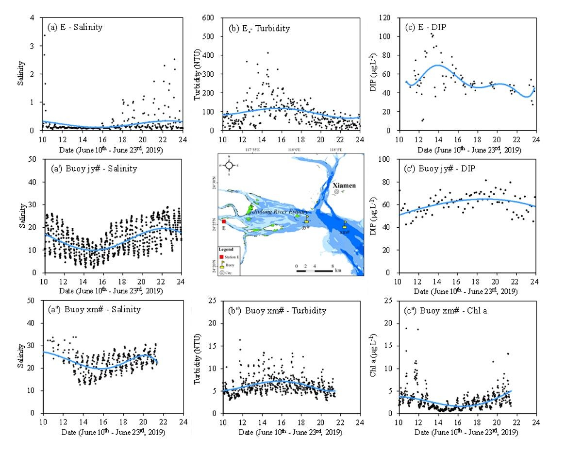 图2. 洪水期间九龙江河流-河口-近海同步观测的盐度、浊度、无机磷(DIP)与叶绿素(Chl a)变化过程。E为九龙江口上游最大浑浊带站位,jy#和xm#分别为九龙江口(鸡屿)站位和厦门湾南部海域浮标站位
