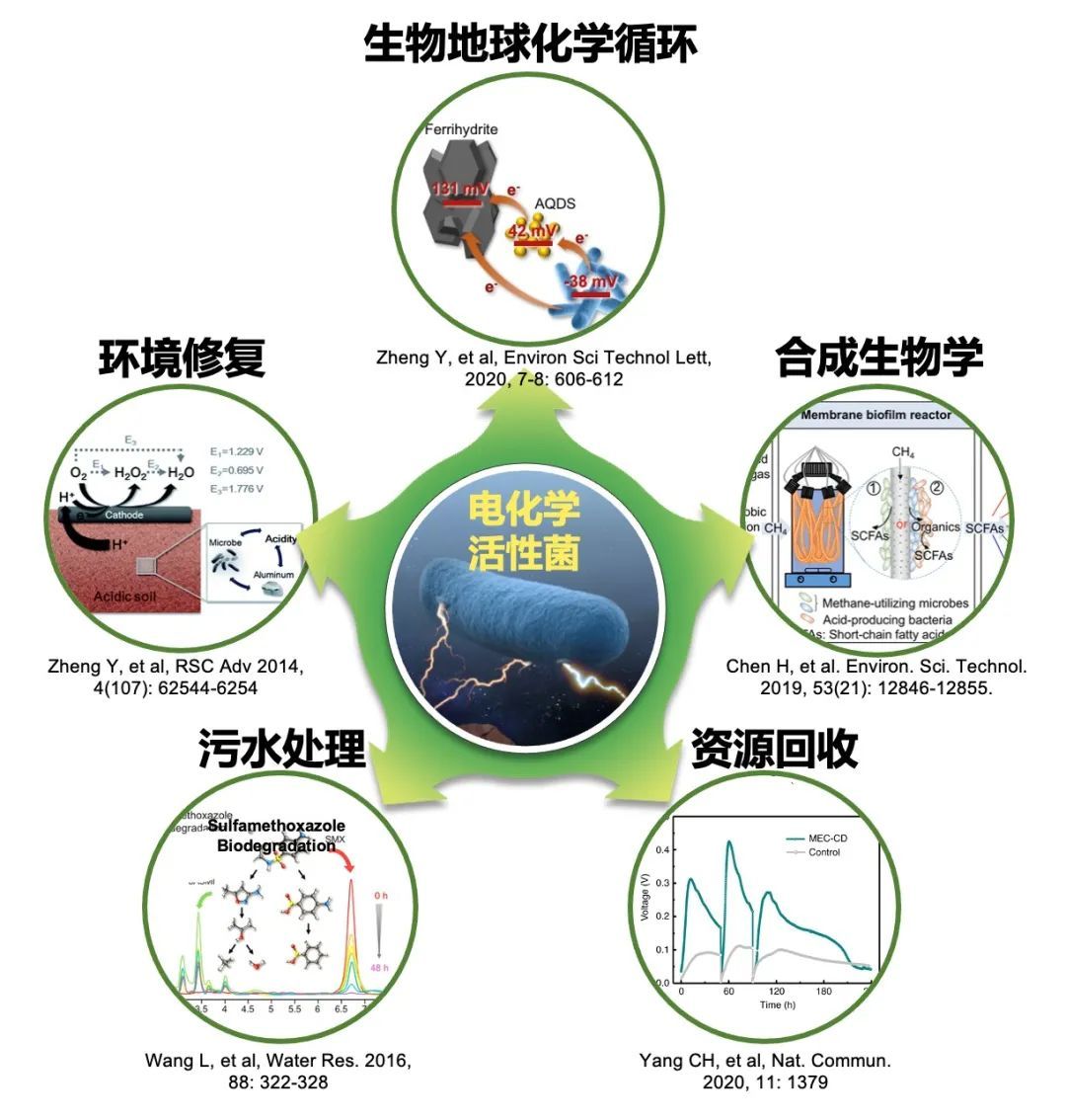生命代谢的本质是基于电子转移的生化反应过程。1911年微生物Saccharomyces和Bacillus被发现能够产生电流。在随后的一百多年中,研究人员在跨越古菌、细菌、真菌的9个门类微生物中均证实了微生物产电现象,并将这类通过胞外电子传递实现能量代谢的微生物统称为“电化学活性菌”(Electrochemically Active Microbes)。电化学活性菌是生物地球化学循环(包含碳循环、氮循环、硫循环、铁循环等)中的关键驱动者,也在环境修复、污水处理、资源回收、合成生物学等领域表现出重要的应用前景(图1)。