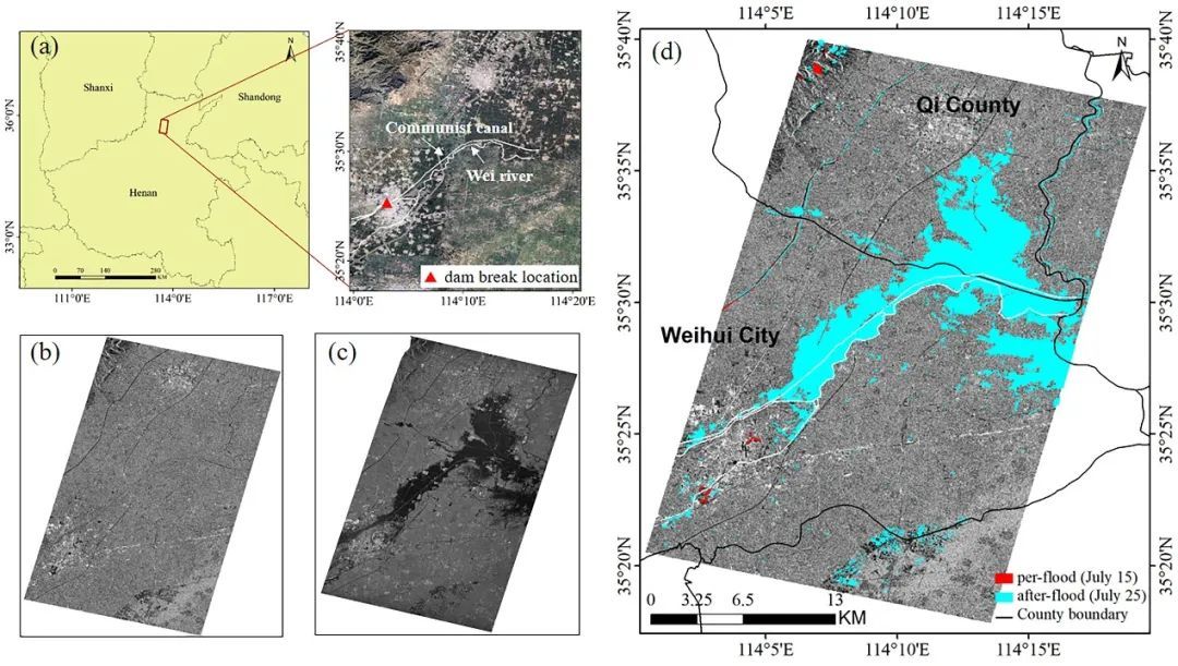 我国是洪涝灾害发生最频繁的国家之一,每年因洪涝灾害造成大量的经济损失和生态环境破坏。随着全球持续变暖,洪灾的发生强度和频次呈上升趋势,如何应对日益增加的洪灾风险成为应急救灾的重中之重。2020年12月22日,我国首颗轻小型合成孔径雷达(Synthetic Aperture Radar,SAR)卫星厦门大学“海丝一号”在海南文昌卫星发射中心成功发射。“海丝一号”可以穿透云层,具有全天时、全天候的工作能力,观测时不受云雨等天气条件及白天黑夜的限制,其最高分辨率可达1 m,最大幅宽可达100 km,可为洪涝灾害监测和应急管理等提供高分辨率的SAR遥感影像。