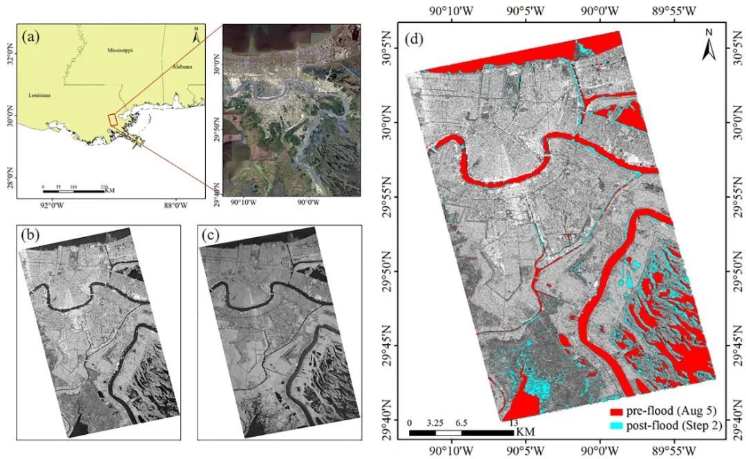 该模型在保证高精度水体分割结果的同时,提升了洪灾水体检测的速度,且能克服复杂的阴影和背景,在不同水体形态中均有良好的分割效果。研究团队将该模型应用于河南特大洪水(图2)和美国飓风Ida淹水事件(图3)两个实例中,获得了高精度的反演结果,展示了该模型在灾害事件评估和应对方面的应用价值。