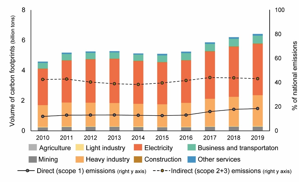 研究结果显示,针对电力和重工业企业温室气体排放的减缓行动对于减少上市企业的碳足迹也至关重要。中国上市企业碳足迹总量中超过一半(52.9%)均来自于电力生产行业,其次是重工业(32.0%)