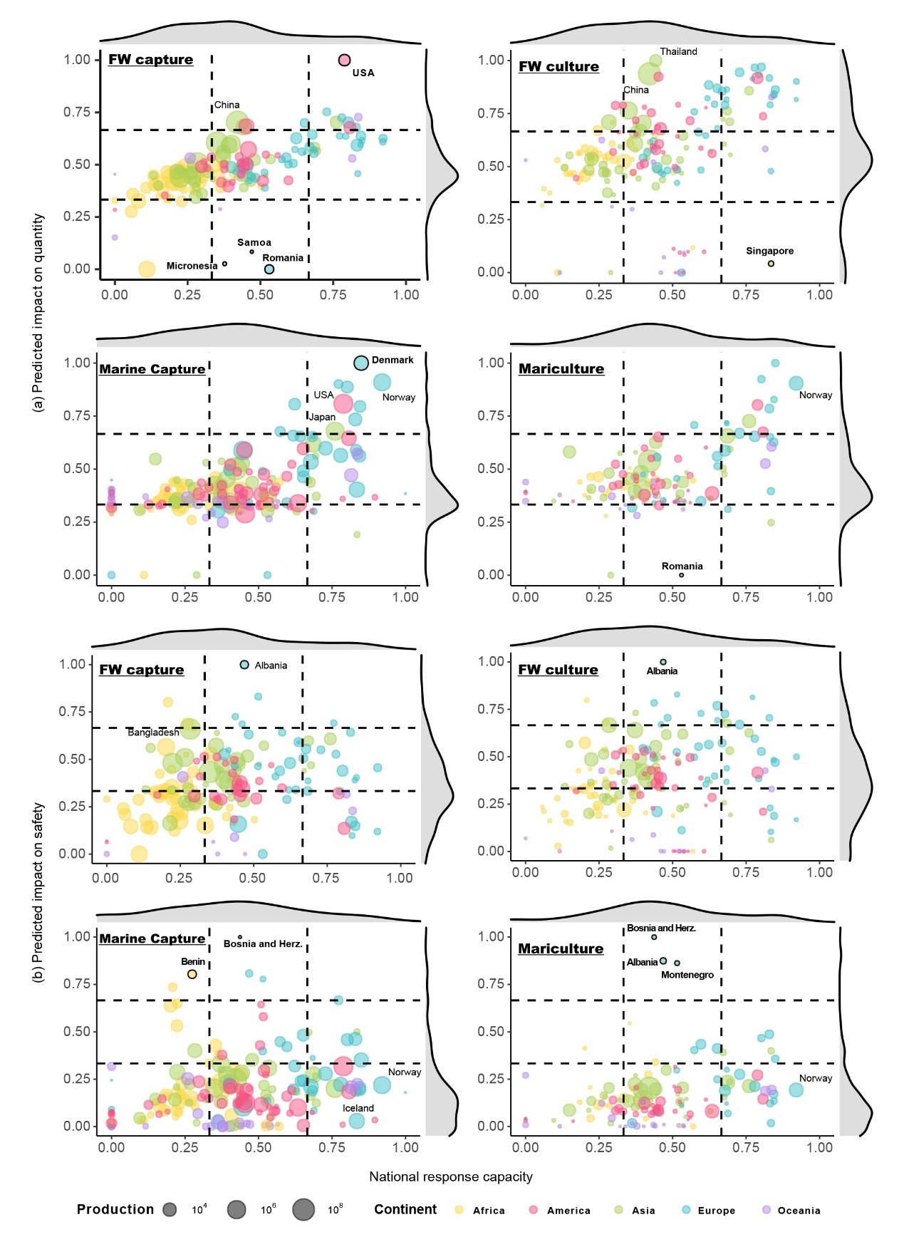 该研究构建了一套基于多因素空间分析的蓝色食物脆弱性评估框架。首先,通过系统性文献分析和专家征询,研究团队确定了17种最具代表性的扰动蓝色食物生产的压力源,以及15种主要的蓝色食物生产类别,涵盖了淡水捕捞、淡水养殖、海水捕捞、海水养殖四大生产系统,并评估了15×17个“生产类别-压力源”组合的脆弱性等级(图1)。其次,通过构建多因素空间模型,量化了全球环境压力对蓝色食物产量和安全性的影响指数,并描绘了其脆弱性分布格局(图2)。研究结果表明,海洋捕捞渔业更易受气候相关压力源的影响,尤其是全球变暖和海洋酸化,而水产养殖则对疾病和水体缺氧较为敏感。就全球格局而言,贡献了全球90%以上蓝色食物的主产国所受到的环境变化影响均为中高等级以上,其中美国和部分亚洲生产大国(如日本、越南、泰国)面临的风险尤为显著。环境变化对蓝色食物产量造成的风险在海洋和淡水生产系统中普遍突出,而对于蓝色食物安全性的风险则集中在少数区域。研究指出,一些脆弱性较高、应急响应能力较弱的亚洲、拉丁美洲、非洲国家(如孟加拉国、洪都拉斯、多哥等),应当受到特别关注(图3)。