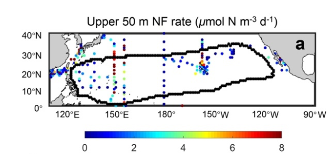 在NPSG,固氮是支持生物生长和碳输出的主要氮源之一(图2)。在NPSG的不同区域,固氮可能受铁、磷单一或者共同限制。本研究的数据初步分析显示,在HOT附近,观测到的铁浓度比NPSG其它海域高,可能是NPSG一个固氮的热点区域。
