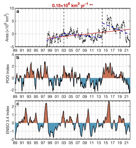 图3. NPSG的(a)面积、(b)PDO指数和(c)ENSO指数的长期变化。