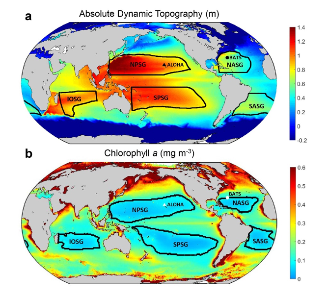 图1. 根据(a)海面高度和(b)叶绿素浓度(小于0.1 mg m-3)计算的海洋五个副热带流涡区范围。