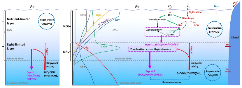 在NPSG真光层内,营养盐跃层往往比混合层深;因此,营养盐跃层以上形成了一个营养盐匮乏层(Nutrient-depleted layer, NDL);NDL以深到真光层底部,则形成了一个营养盐充足层(Nutrient-replete layer, NRL)。在真光层的这两层结构中,营养盐的来源、初级生产力的水平、生态系统的结构以及输出生产力运作效率等,都存在显著差别。本研究提出,对副热带流涡区海洋真光层生物地球化学过程,在此双层结构框架下进行研究(图4),有望极大提高我们对副热带流涡区固碳机理及增汇潜力的认识。