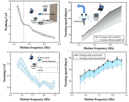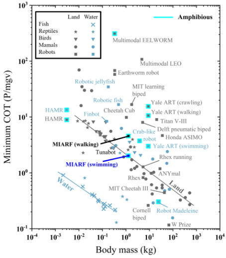 图2. 仿生弹涂鱼两栖机器人MIARF与其他机器人和生物的最小运输成本对比