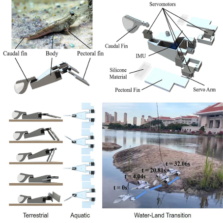近日,厦门大学近海海洋环境科学国家重点实验室、海洋与地球学院、水声通信与海洋信息技术教育部重点实验室张宇教授团队及其合作者在跨介质机器人领域取得重要进展,相关成果以“Mudskipper-inspired amphibious robotic fish enhances locomotion performance by pectoral-caudal fins coordination”为题发表于Cell Reports Physical Science. 此次研发的仿生弹涂鱼两栖机器人能够实现较好的多功能性和环境适应性,为研发新型仿生两栖机器人提供了重要参考。