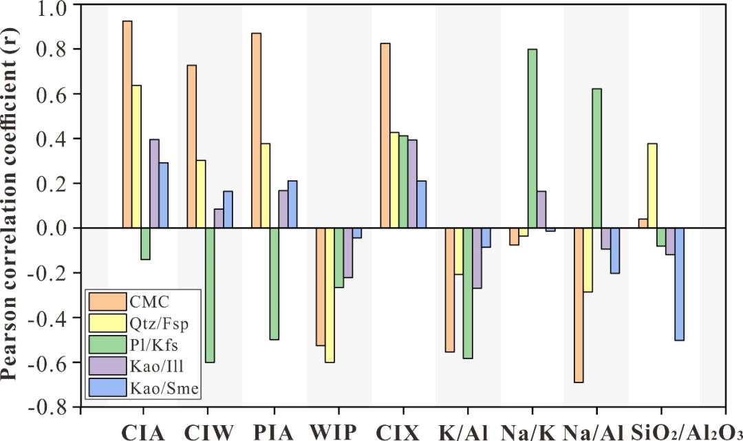 图3. 化学风化强度指标对粘土矿物含量CMC、石英/长石Qtz/Fsp、斜长石/钾长石Pl/Kfs、高岭石/伊利石Kao/Ill、高岭石/蒙脱石Kao/Sme比例变化的敏感性差异。皮尔逊相关系数(r)绝对值越接近1表示越相关性越强,显著性水平p < 0.01