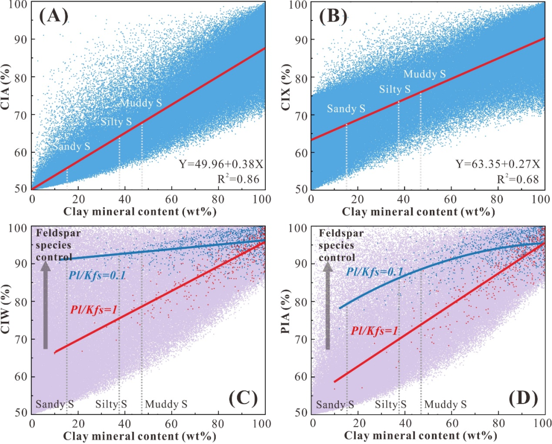 图1. 化学蚀变指数CIA、改进版化学蚀变指数CIX、化学风化指数CIW、斜长石蚀变指数PIA的值随粘土矿物含量(Clay mineral content)的变化,砂质沉积物(Sandy S)、粉砂质沉积物(Silty S)、泥质沉积物(Muddy S)的平均粒径逐渐减小,粘土矿物含量逐渐增大,对应指标的值也有所变化