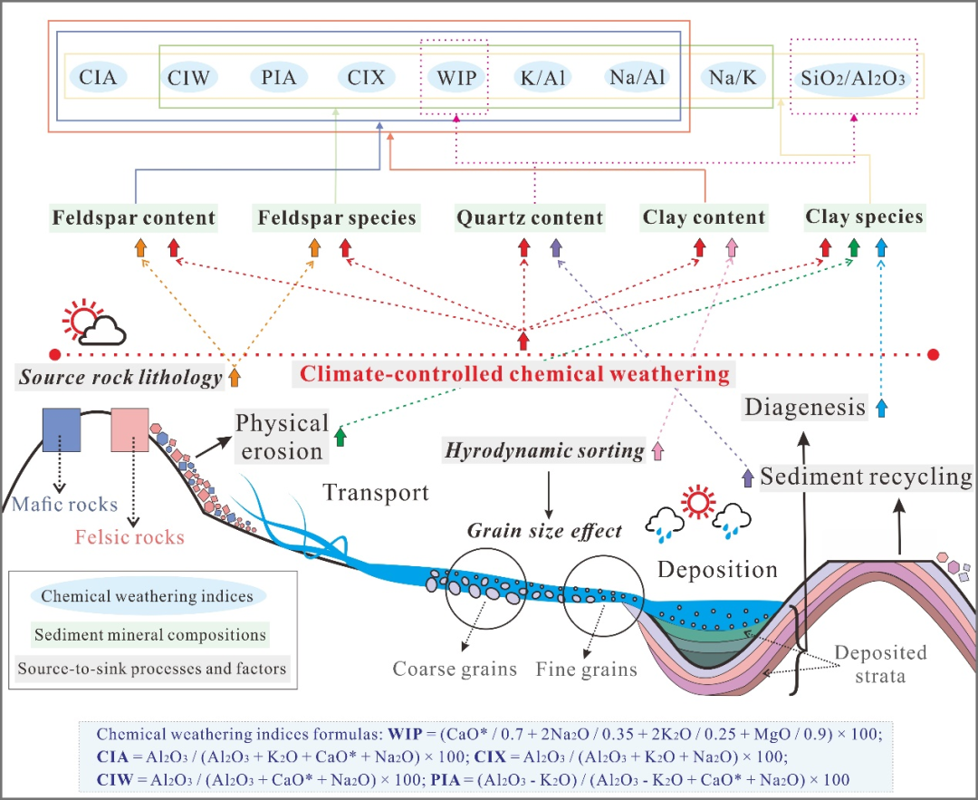 然而,这些风化指数所依赖的沉积物元素地球化学或者矿物组成,除了受化学风化影响外,还可能受到源区母岩岩性差异、水动力分选造成的粒度差异、成岩矿物蚀变和沉积再旋回的综合影响。这些非气候-风化因素也会造成化学风化指数值的变化,不准确的量化结果会进一步使得沉积记录里的古气候信息解译出现偏差。因此,亟需阐明沉积源-汇过程、沉积物组成、化学风化强度之间的关系,并量化沉积物组成、粒度等方面的差异对常用化学风化强度指标的影响。