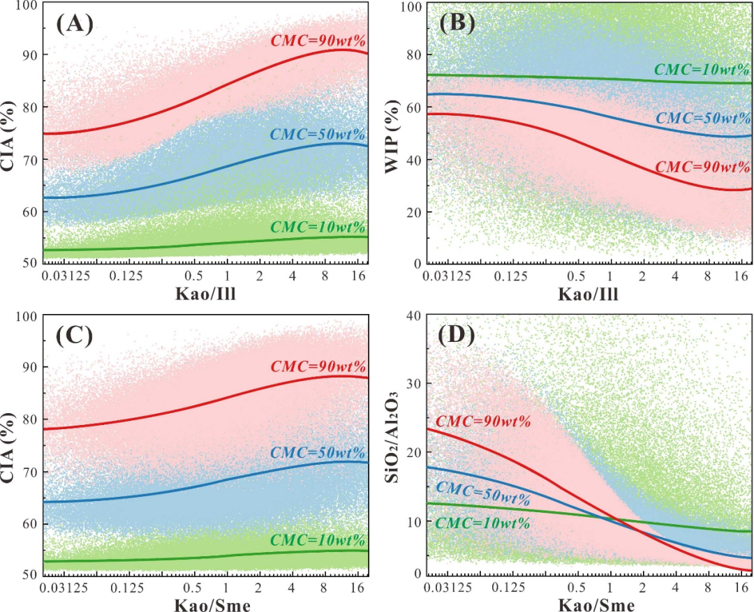 图2. 在三种粘土矿物含量条件下(Clay Mineral Content=10wt%, 50wt%, 90wt%),化学蚀变指数CIA、帕克风化指数WIP、SiO2/Al2O3指标对沉积物中粘土矿物种类变化(高岭石/伊利石Kao/Ill、高岭石/蒙脱石Kao/Sme)的响应情况
