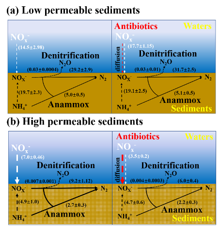 图4. 抗生素在不同渗透性能沉积物中的扩散能力决定其对脱氮微生物的抑制作用