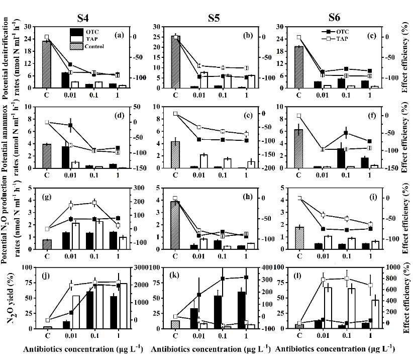图1. 九龙江口各站位潜在脱氮速率及其对抗生素的响应