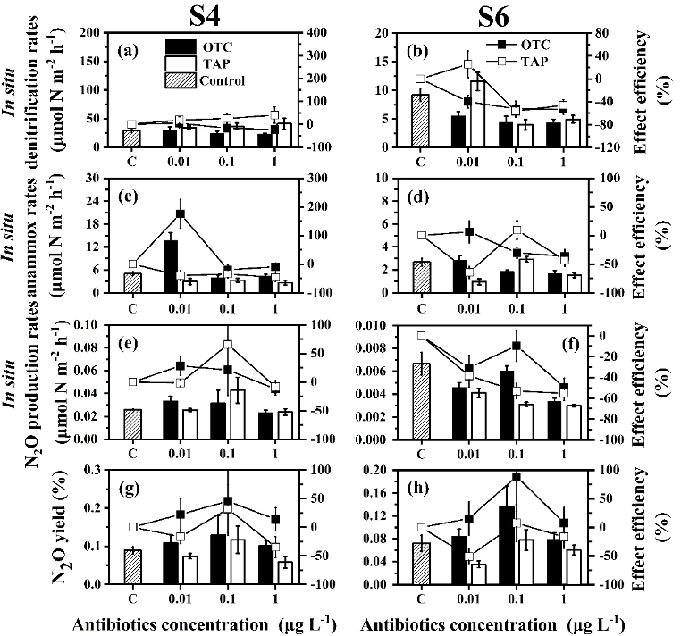 图2. 九龙江口上下游原位脱氮速率及其对抗生素的响应