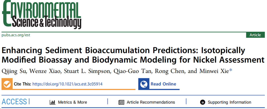 1. Qijing Su, Wenze Xiao, Stuart L. Simpson, Qiao-Guo Tan, Rong Chen, Minwei Xie*, Enhancing sediment bioaccumulation predictions: Isotopically modified bioassay and biodynamic modeling for nickel assessment, Environmental Science & Technology, 2023, DOI:10.1021/acs.est.3c05914