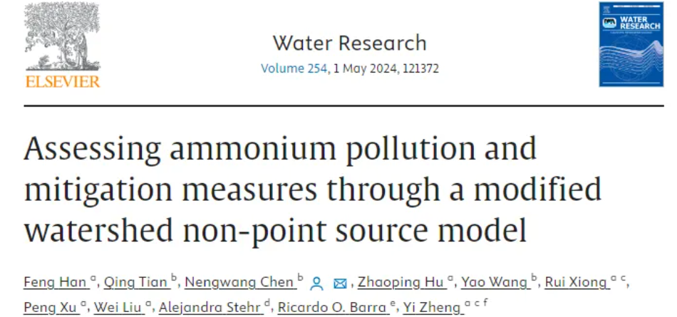 Han, F., Tian, Q., Chen, N.W.*, Hu, Z.P., Wang, Y., Xiong, R., Xu, P., Liu, W., Stehr, A., Barra, R.O., and Zheng, Y. (2024). Assessing ammonium pollution and mitigation measures through a modified watershed non-point source model. Water Research, 254: 121372