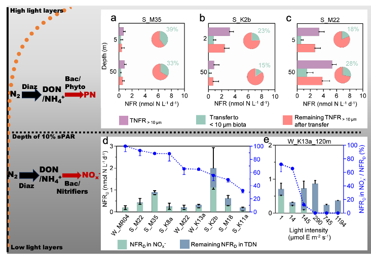 2)在近原位观测中,溶解态份额中的固氮速率占比3-97%,且随深度增加其占比逐渐提高(图1 c-d)。进一步实验发现,释放的DDN在不同光强条件下,出现传输路径差异。在高光区域,15-33%释放的DDN被生物再吸收,转化成颗粒态的有机氮(图3 a-c);而在低光区域,大约70%释放的DDN通过硝化作用转化为溶解态的NOx-(图3 d-e)。这样的光控双通路是溶解态份额占比随深度增加而增加的主因。