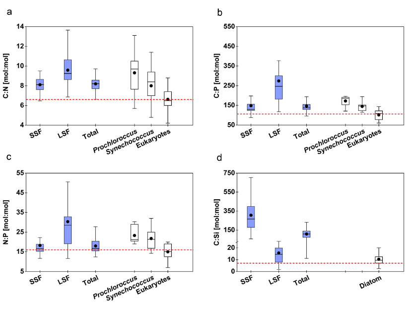 图2. 上层500米水柱中颗粒C:N、C:P、N:P、C:Si比值的垂直分布。SSF:小粒径颗粒物(0.8-51 μm);LSF:大粒径颗粒物(>51 μm);Total:总颗粒物(>0.8 μm)