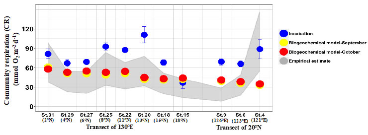 研究团队利用西太平洋航次,通过开展现场甲板培养,同时结合生物地球化学模型和经验性模型估计等多种手段,对决定寡营养生态系统代谢平衡的两个关键因素—总初级生产和群落呼吸过程进行比较分析。研究人员将甲板培养测定的结果和基于生物地球化学模型输出比较,发现基于黑白瓶法测定的总初级生产力和生物地球化学模型结果相接近,而培养方法测定的群落呼吸显著高于生物地球化学模型结果。研究人员进一步利用同航次测定的细菌生产力和初级生产力,结合文献报道的主要生物类群生长效率,经验性对不同类群的群落呼吸进行估算。结果惊人的发现,通过生长效率估算的群落呼吸显著低于黑白瓶法的测定结果,但和生地化模型输出结果非常吻合。通过多种方法比较与交叉验证,说明黑白瓶法指示的寡营养海区异养信号主要可能由于系统性地高估群落呼吸而非低估总初级生产力。该研究为目前广为争议的“寡营养生态系统代谢平衡状态”在方法学角度提供了新的见解,也是深入认识寡营养海区生物泵过程重要的一步。