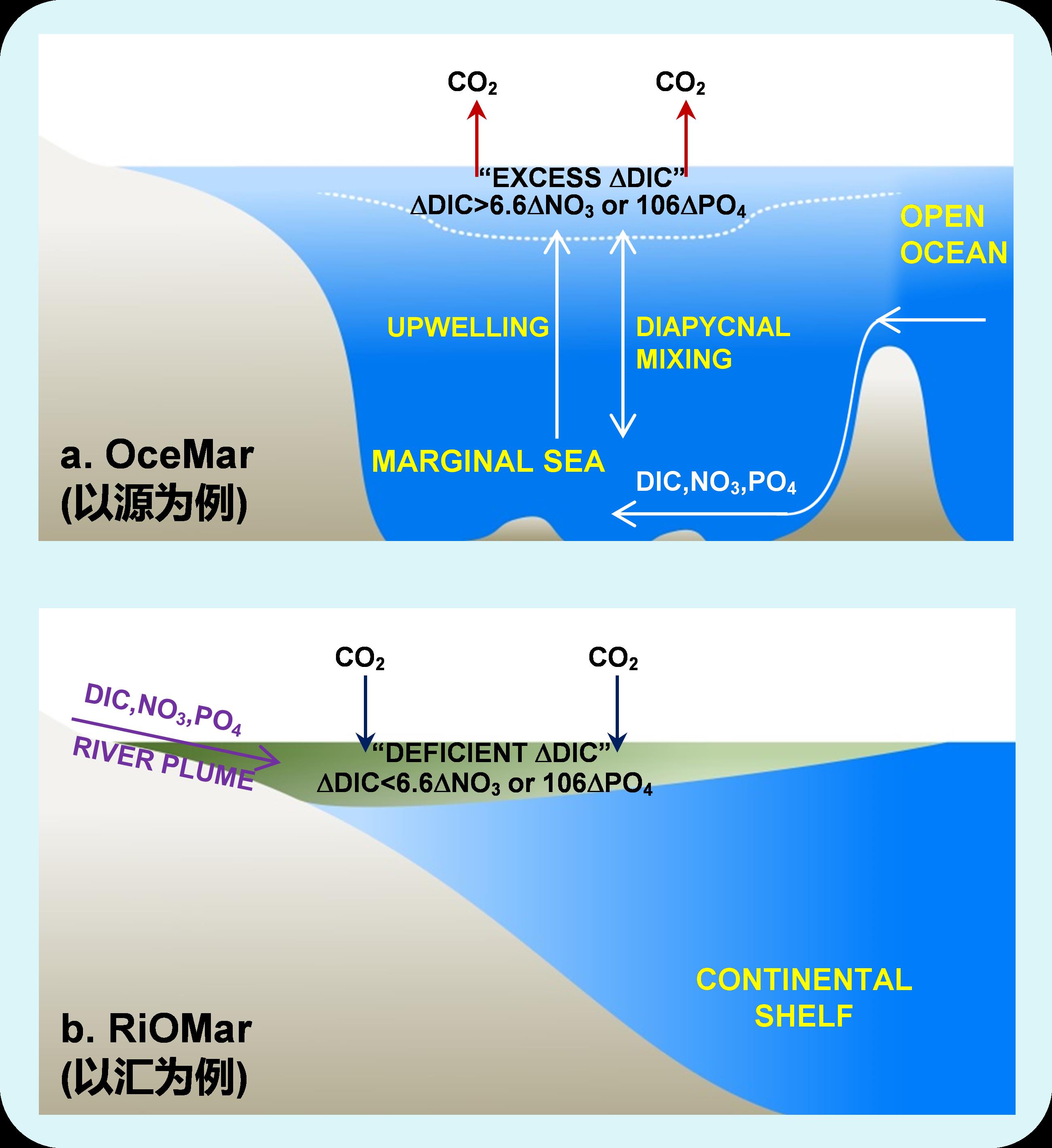 基于“边缘海-大洋”和“陆地-边缘海”两个界面的物质交换,该团队构架了OceMar和RiOMar碳循环概念框架。两类系统分别接受大洋和河流输入的外源无机碳和营养盐,经由一系列动力过程进入边缘海真光层后同时被生物消耗,无机碳和营养盐之间的“竞争”最终决定边缘海CO2源汇格局。若无机碳过剩,则以CO2形式向大气释放,即为源;若无机碳不足,则需从大气补充CO2,即为汇。