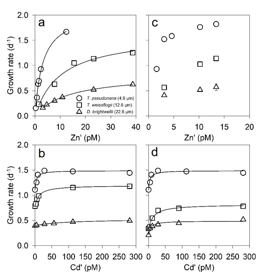 图1. 不同Zn′和Cd′浓度下假威海链藻(Thalassiosira pseudonana)、威氏海链藻(Thalassiosira weissflogii)和布氏双尾藻(Ditylum brightwellii) 的生长速率。(a)无Cd添加;(b)每种藻分别添加等于其KZn′的Zn′浓度;(c)添加10 pM Cd′;(d)添加3.1 pM Zn′。