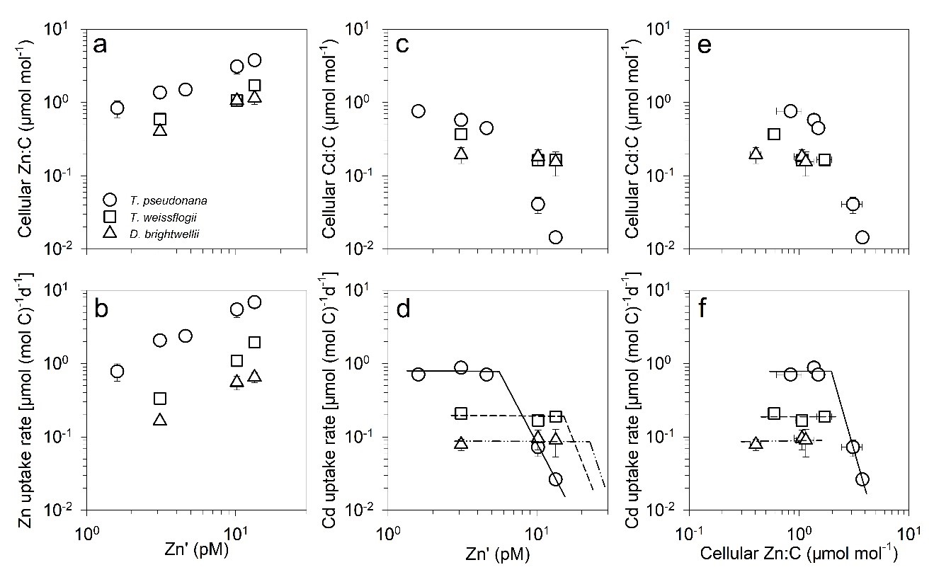 图2. Zn′浓度与三种硅藻细胞Zn:C(a)、Zn吸收率(b)、细胞Cd:C(c)和Cd吸收率(d)之间的关系以及细胞Zn:C与Cd:C(e)和细胞Cd吸收速率(f)之间的关系。