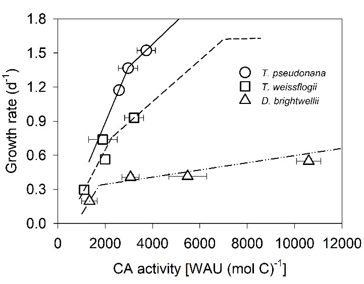 图3. 三种硅藻生长速率与总碳酸酐酶活性之间的关系。