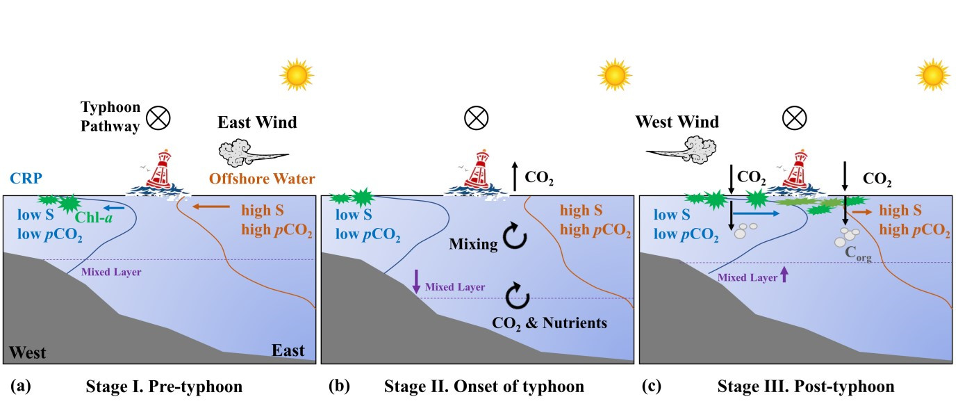 研究发现,在台风前、台风过境时和台风后,上层水体呈现复杂的水平和垂直混合过程,因此把台风过境对海表生物地球化学过程的影响分成三个不同阶段。台风前(东风主导)和台风后(西风主导)水体水平混和增强,而台风过境时垂混合增强。风场影响的水体混合对海表物理和生物地球化学参数产生巨大影响,台风过境后触发浮游植物水华,pCO2大幅降低。