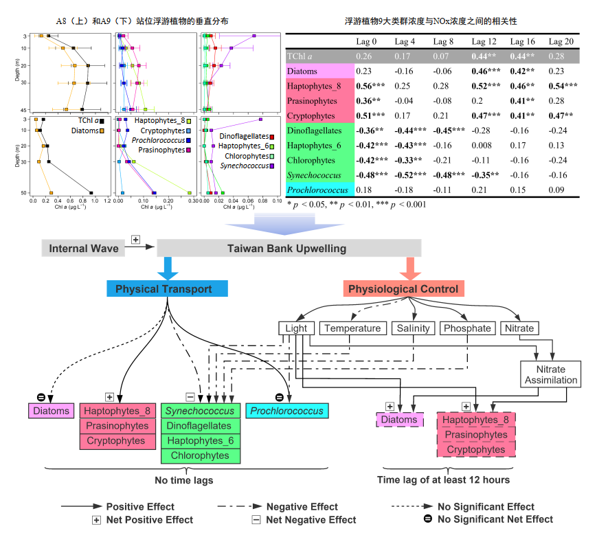 该研究以台湾浅滩上升流为试验场,于2014年8月在该上升流区开展了72小时的时间连续观测,获得了水文、硝酸盐吸收速率、浮游植物光合色素等多参数的高分辨率时间序列数据。数据表明该上升流的强度受到内波的影响,并且影响了上层水体营养盐的波动。浮游植物总叶绿素a随着营养盐浓度的增加而增加,但存在12-16 小时的滞后。这一总体响应是浮游植物9大类群表现出的4种不同响应模式的综合效应。硅藻是上升流区的优势类群,其生物量原本在下层(真光层以下)和真光层差异不大,因此无明显物理输运效应,但硅藻偏好高营养盐,因此在12-16 小时之后表现出正效应;定鞭藻8型、青绿藻和隐藻原本在下层生物量大于真光层,因此物理输运的结果表现出快速正效应(富集作用),同时这些类群适应高营养盐和高光强,因此12小时之后再次表现出正效应;聚球藻、甲藻、定鞭藻6型和绿藻原本主要分布在真光层,因此物理输运的结果表现出快速负效应(稀释作用),同时这些类群在低温、高盐或高磷酸盐的环境中处于竞争劣势,因此生理上也表现出快速负效应,两方面叠加表现出显著的快速负效应;原绿球藻原本在下层大于真光层,物理输运的结果本应是快速正效应,但该类群生理上不适应高营养盐和高光环境,因此抵消了物理上的正效应,最终表现出无显著影响。总体而言,所有表现出快速正响应的类群都在12 小时之后再次表现出正响应,而所有负响应的类群都不存在时滞现象。这些结果强有力地支撑了该研究的科学假设,即浮游植物对内波强化上升流的响应模式是快速的物理输运效应和有时间滞后的生理上行控制的净结果。