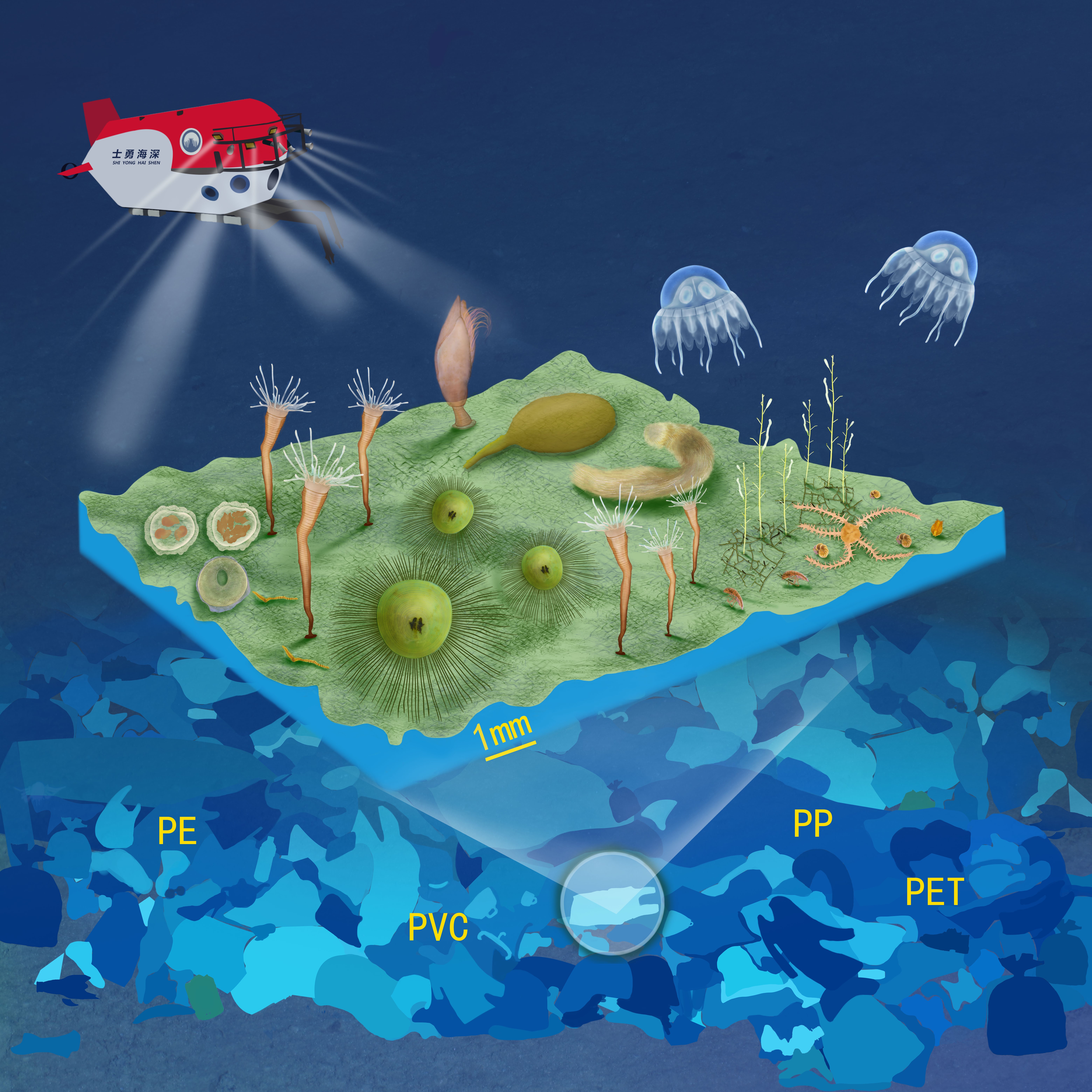 西沙海槽深海塑料表面的生物群落(艺术复原图)