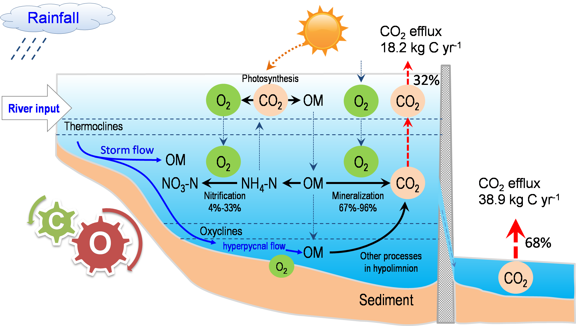 课题组于2017-2018年间开展不同时间尺度的综合观测和验证性机理实验,基于碳氧的生物地球化学计量分析框架,研究发现水库季节性耗氧过程和温室气体CO2产生的不平衡关系。主要研究结果包括:(1)与湖泊不同,水库具有独特的水动力场,夏秋季节形成双层化结构,抑制氧的垂向混合;暴雨径流携带大量外源有机质,加上库区藻华过程合成有机质,水柱有机质微生物分解过程伴随耗氧过程,是库区底部低氧(<2.0 mg/L)持续时间长(7-11月)、低氧深度大(5米以深)的主要原因;(2)夏季低氧可抑制有机碳转化,暴雨洪水异重流输入、支流低温水输入以及冬季混合充氧可以促进底层水有机碳转化;微生物主导CO2排放但存在季节上的“滞后效应”,夏冬两季CO2产生与O2消耗出现不平衡现象,可能与化学自养过程、有机物厌氧分解的碱度缓冲以及硝化过程有关;(3)库区表层水为CO2排放的源(夏季除外),5米以深水柱常年CO2过饱和,通过大坝下泄进入下游河道,再经水气界面释放,贡献了近70%的水库CO2年排放总量(~38.9×106 kg C yr-1)。